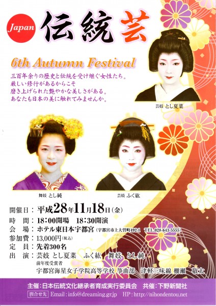 2016年11月18日 イベント 第6回Japan伝統Autumn Festval 完売 2016年11月15日を以って フェスティバルのチケットは完売しました。 京都から芸舞妓3名招聘。 海星女子学院筝曲部演奏。 津軽三味線演奏 どうぞお楽しみに